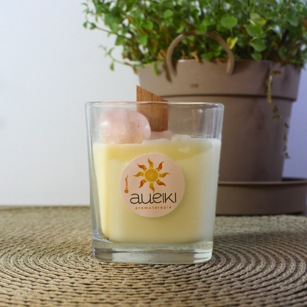 Crie um ambiente de amor e harmonia com a Vela Aromática Quartzo Rosa da Aueiki. Esta vela, feita com cera de coco e enriquecida com a essência revitalizante de bergamota, é perfeita para momentos de autocuidado e meditação.